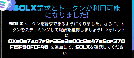 つまり、私がステーキングしているSOLXについた報酬が配布されるわけですね。未だにメタマスクに入ってきていないので不安になっていました・・・