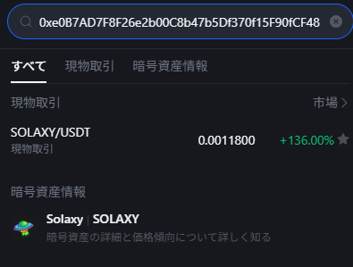 我々が5月から追ってきた本家Solaxyの探し方は簡単で、公式サイトにあるコントラクトアドレスを検索窓に入れて出てくるコインが本物です。