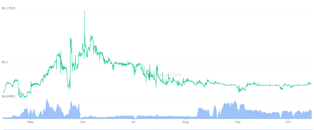 以降価格が徐々に下降し、2023年10月時点では0.07ドル前後(約10円)に落ち着いています。