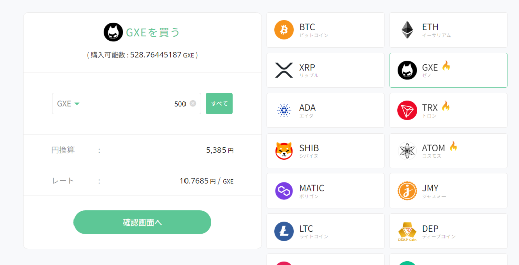 表示されている仮想通貨の一覧から、GXEを選択しましょう。