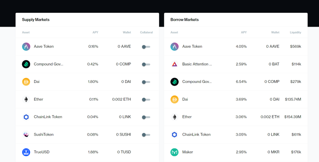 - 仮想通貨の貸し借りで、金利収入や仮想通貨COMPを獲得可能