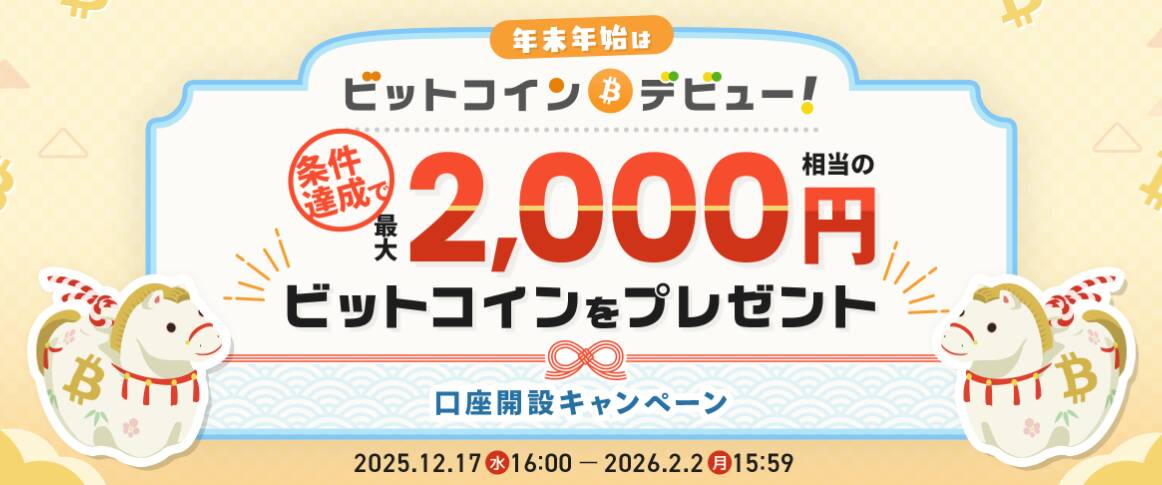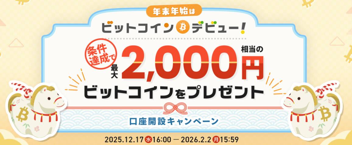 期間中に新しく口座を開設し、合計1,000円以上の暗号資産を購入した方を対象に、ビットコインがもらえる内容となっています。口座開設のみの場合でも一定額のビットコインが付与される仕組みです。