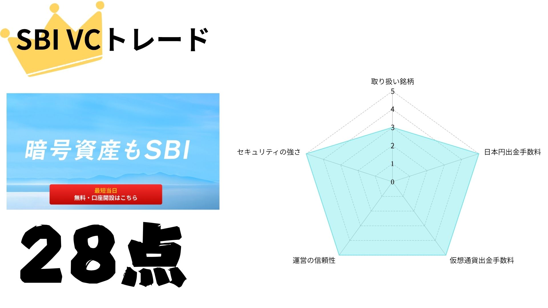 先にランキング1位を発表しておくと、SBI VCトレードが28点/30点となり1位に輝きました。Mediverse(メディバース)チームでも利用している取引所なので、まだ取引所の口座を持っていない方は是非ご利用ください。