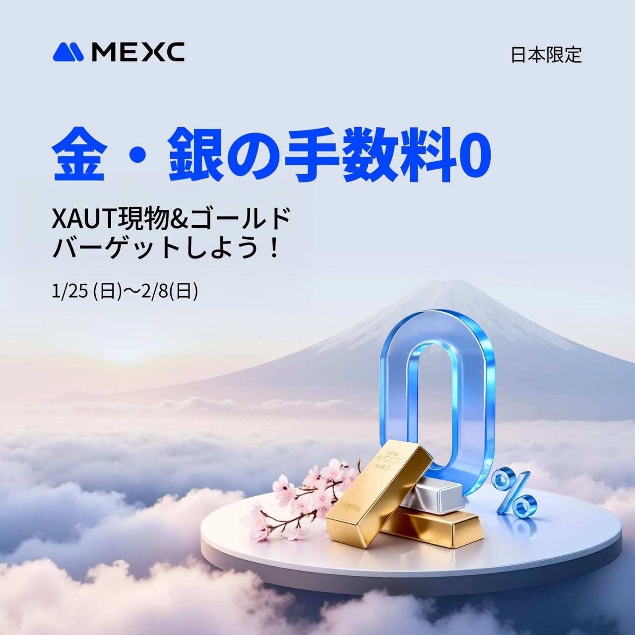 MEXCが日本限定で開催している「新年ゴールドラッシュ:金・銀の取引手数料0」キャンペーンは、イベント期間中に対象の金・銀取引の手数料が無料になるほか、取引実行や入金・認証を行うことでゴールド報酬や賞品が獲得できるプロモーションです。