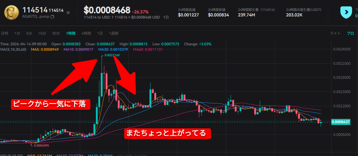 2026年1月に流行った野獣先輩を模した114514コインやサナエトークンなど、これらのミームコインはまさに高騰中に購入して暴落前に売却しなければ大きな赤字となります。つまりは参入タイミングがすべてということです。