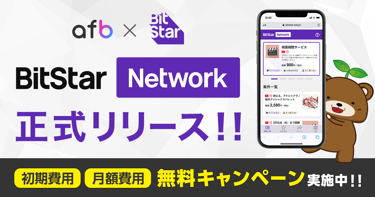 アフィリエイトプラットフォーム「afb(アフィビー)」の開発運用をおこなう株式会社フォーイットと、YouTuberをはじめとするクリエイタープロダクション事業・コンテンツ制作事業・インフルエンサーマーケティング事業を展開する株式会社BitStar(本社:東京都渋谷区、代表取締役社長CEO:渡邉拓、以下BitStar社)は、インフルエンサーと広告主をつなぐ成果報酬型のインフルエンサーマッチングサービス「BitStar Network(ビットスターネットワーク)」を共同開発し、2021年5月18日に正式リリースいたしました。
