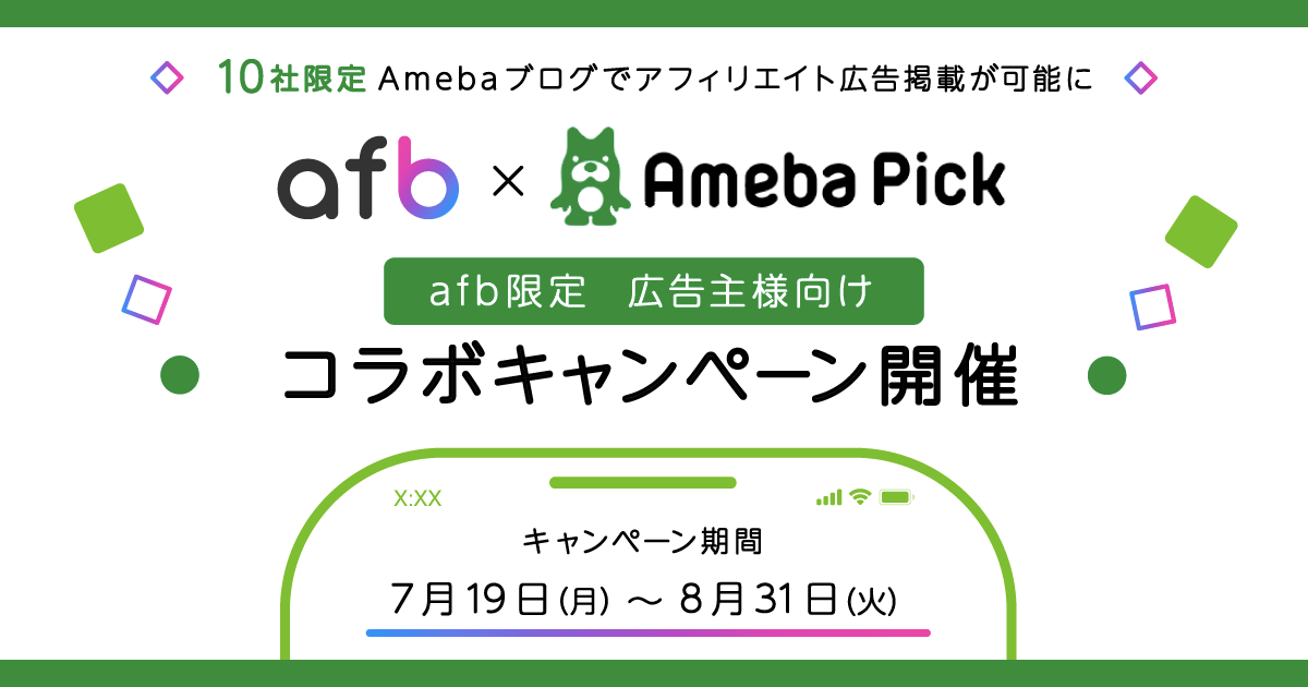 アフィリエイトプラットフォーム「afb(アフィビー)」の開発運用をおこなう株式会社フォーイットは、株式会社サイバーエージェント(本社:東京都渋谷区、代表取締役 藤田 晋、以下「サイバーエージェント」)が運営する「Ameba pick(アメーバピック)」と連携し、先着10社限定でafbからAmebaブログへアフィリエイト広告が出稿できるキャンペーンを、7月19日(月)~8月31日(火)の期間で開催いたします。