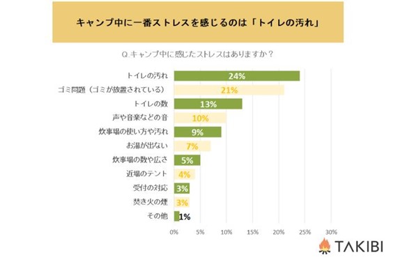 キャンプ中に感じたストレスで一番多かったのは「トイレの汚れ(24%)」。