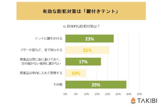 その他(29%)では、「防犯カメラを付ける」「人感センサー・ライトを設置する」「テント内のライトを常時点灯しておく」「余分な貴重品を持っていかない」などの回答が挙がりました。