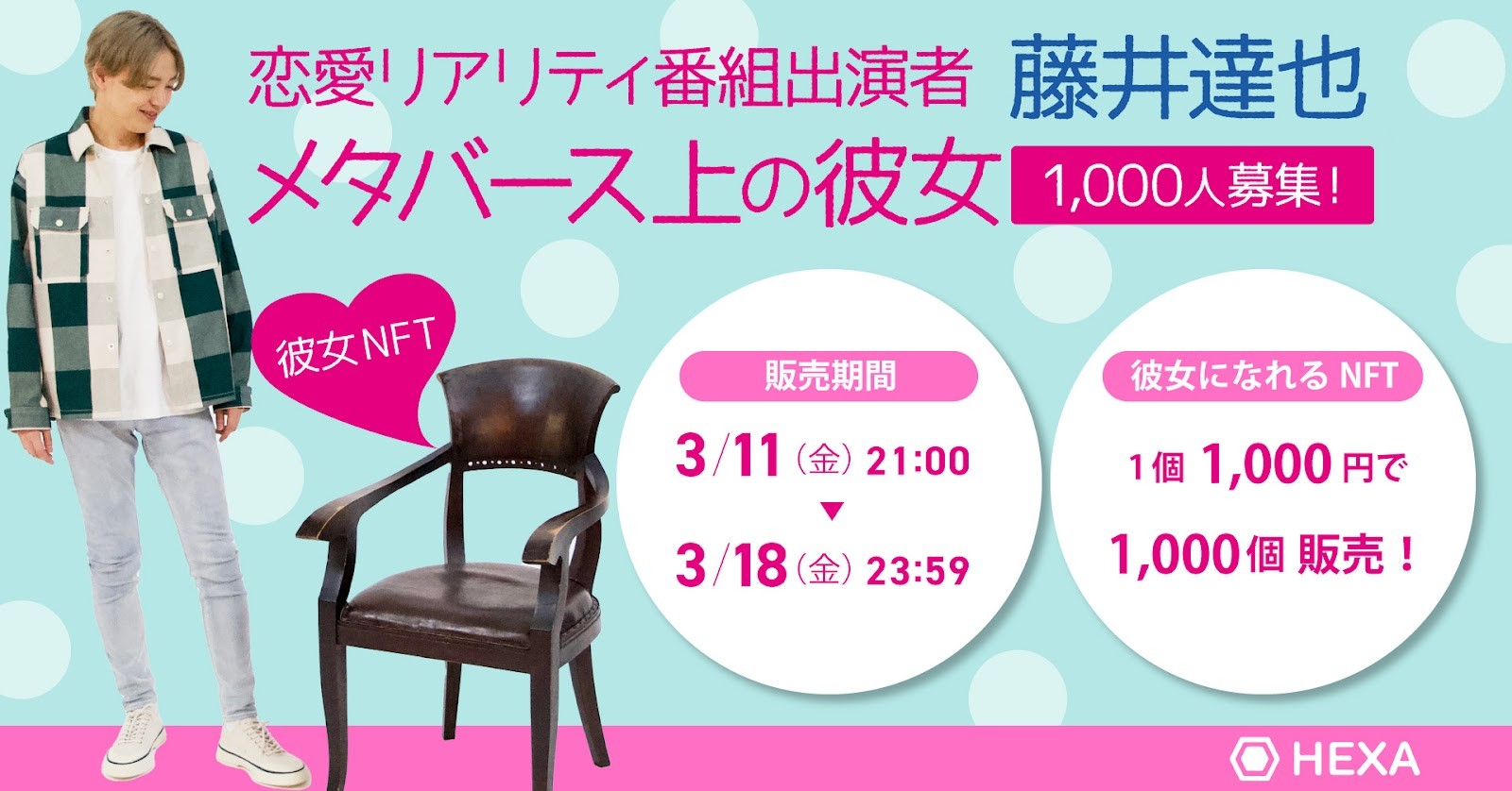 【彼女NFT×メタバース】藤井達也の彼女になれるNFTを1,000円(税抜)で発売!恋愛リアリティ番組出演者がメタバース上の彼女を1,000人募集!