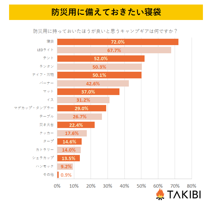 防災用に持っておいたほうが良いと思うキャンプギアを調査したところ、最も名前が挙がったのは寝袋(72%)でした。保温力が高く軽いダウン素材の寝袋があれば、外気の寒さを感じずにぐっすり眠ることができます。 いずれも最低限必要な防災グッズとして、持ち出し用防災セットに入れておくと良いでしょう。