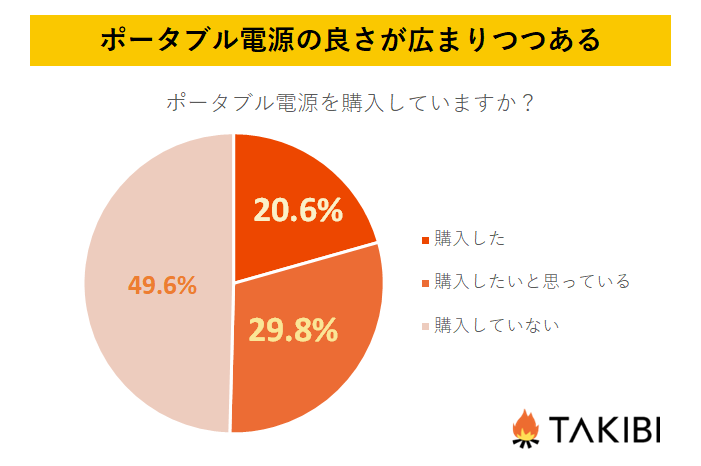 ポータブル電源を既に持っている人は20.6%、購入したいと思っている人は29.8%で「ポータブル電源を持っている・購入したい」が過半数を越える結果となりました。
