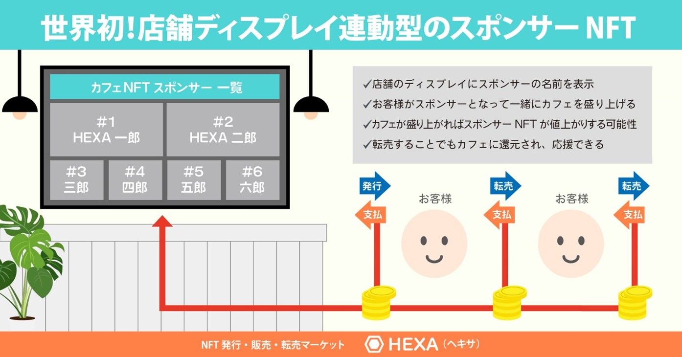 スポンサーNFTを保有すると、店舗のデジタルサイネージに自身の名前を掲載することで(予定)店舗スポンサーであることを公言でき、またNFTページ上からその証明をすることができます。さらにスポンサーNFTはHEXA内でいつでも転売可能で、転売するたびに転売額の最大10%がKAPE TAYO TOKYOに還元される仕組みです。