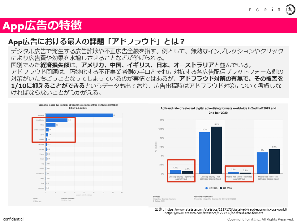 しかしながら、その一方で、アドフラウド問題(デジタル広告で発生する広告詐欺や不正広告全般を指し、例として、無効なインプレッションやクリックにより広告費や効果を水増しさせることなどが挙げられる)は深刻化しており、アプリ広告における最大の課題とも言えます。