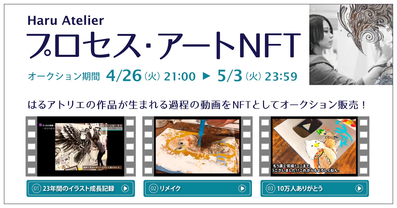 NFTでは動画も1点物のオリジナル作品として価値づけを行うことができます。その特徴を生かし、今回『はるアトリエ』の作品が生まれる過程の動画を『プロセス・アートNFT』として販売いたします。
