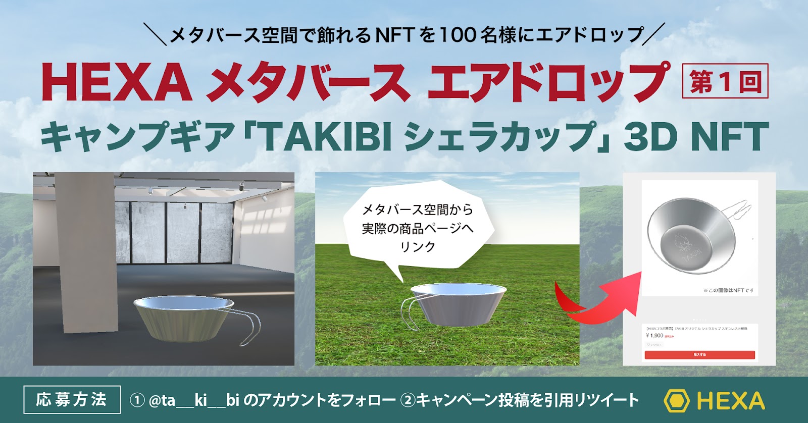 今回のプロジェクトはセカンドセールに引き続き、キャンプ・アウトドアの総合情報メディア「TAKIBI」が初めてプロデュースしたキャンプギア「TAKIBIシェラカップ」の3D NFT画像をHEXAメタバースエアドロップとして発行し、6月16日(木)より100個をプレゼントします。また、メタバース空間上に飾られたTAKIBIシェラカップ3D画像から実際の商品販売ページに飛ぶことが可能となっており、実物の商品がほしい方はリンク先からすぐに購入が可能となっております。