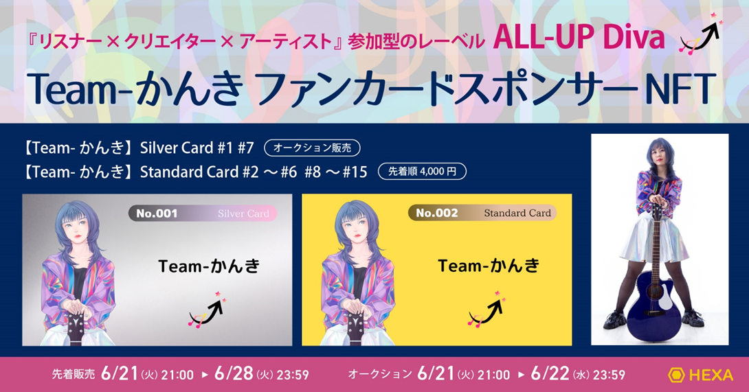 株式会社フォーイットと資本業務提携を締結したメディアエクイティ株式会社(本社:東京都品川区、代表取締役 椛島 誠一郎、以下「メディアエクイティ社」)は、クリエイター・コンテンツホルダー等のさまざまなステークホルダーとの共創によるNFTの普及と発展を目的に、『ALL-UP Diva』のアーティスト「かんき」 のファンカードスポンサーNFTをセカンドセールとして6月21日(火)21:00~から開始いたします。