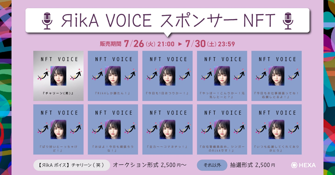 今回は、セカンドセールとして『ALL-UP Diva(オールアップディーバ)』のアーティスト「ЯikA」が自身の声を録音したデータをVoiceスポンサーNFTとしてHEXA(ヘキサ)で販売いたします。「ЯikAしか勝たん!」、「今日も1日おつりかー!」、など音声はすべて違った内容になっており1点物となっております。「ЯikA」のVoiceスポンサーNFTを保有することで、アーティスト「ЯikA」のスポンサーであることを公言でき、またNFTページ上からその証明をすることができます。「ЯikA」がより人気になると、個人や企業がスポンサー枠を購入する需要が生まれ、スポンサーNFTの価値が高まります。
