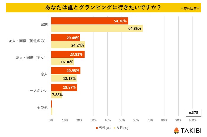 キャンプを中心としたアウトドア総合情報サイト「TAKIBI」の運営をおこなう株式会社フォーイット(本社:東京都渋谷区、代表取締役:吉澤竹晴)は、全国の10代~60代までの男女375人を対象にグランピングに関するアンケートを実施し、男女別・年代別の特徴についてまとめました。