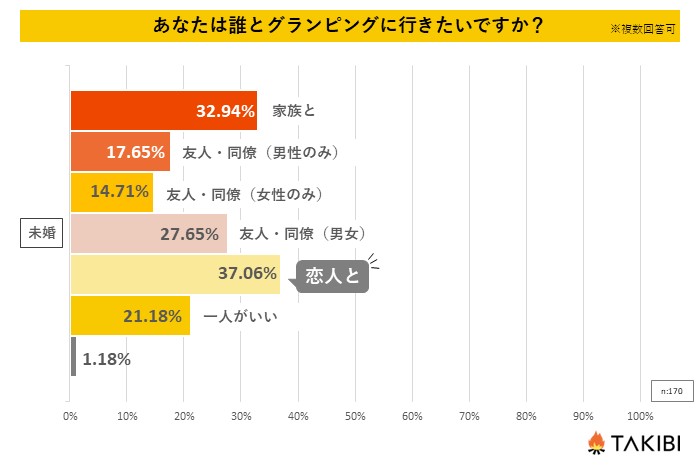 数人で行くイメージがあるグランピングですが、意外にも「一人がいい」という方が全体の13.87%という結果に。