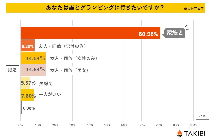 10代~60代の男女を対象とした「あなたは誰とグランピングに行きたいですか?」というアンケートで最も多かった回答は「家族と行きたい」で全体の半数以上の59.2%という結果になりました。