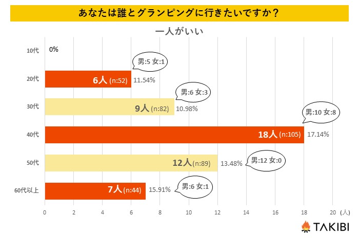 ■グランピングに「一人で行きたい」人が全体の13.87% 特に40代に多い