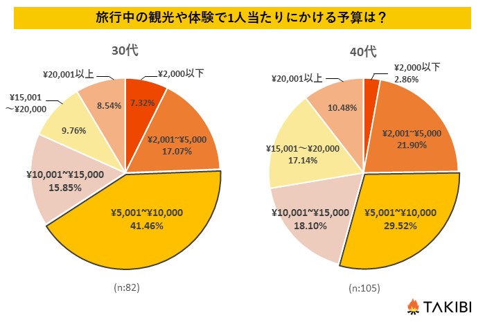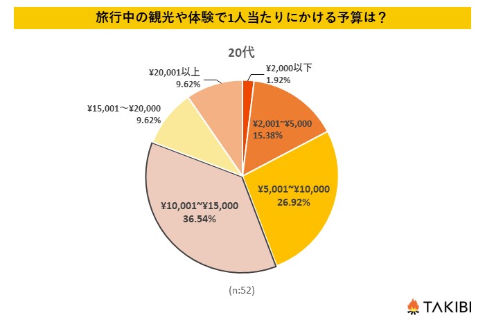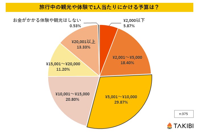 20代~60代の男女を対象とした「旅行中の観光や体験で1人当たりにかける予算は?」というアンケートで最も多かった回答は「¥5,001~¥10,000」で全体の29.87%という結果になりました。