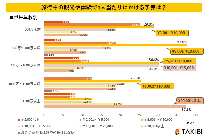 なんと世帯年収別に見ても、観光や体験にかける予算は「¥5,001~¥10,000」が1番多いという結果になりました。