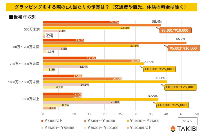 ではここで、交通費や観光、体験等の料金を除いたグランピング施設への予算を世帯年収別に見ていきたいと思います。