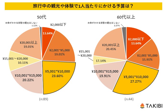 20代は仲のいい友人や同僚と行く傾向があり、アクティビティにかける予算が高くなっているのだと推測します。また、年代が上がるにつれ、予算も上がるという結果も出ており、50代以上では¥20,001以上の比率が他の世代に比べて高い傾向もあります。30代・40代は家族で、50代以上は夫婦で行く という風に年代によって家族構成が異なり、その背景がこの結果に反映されていると言えます。