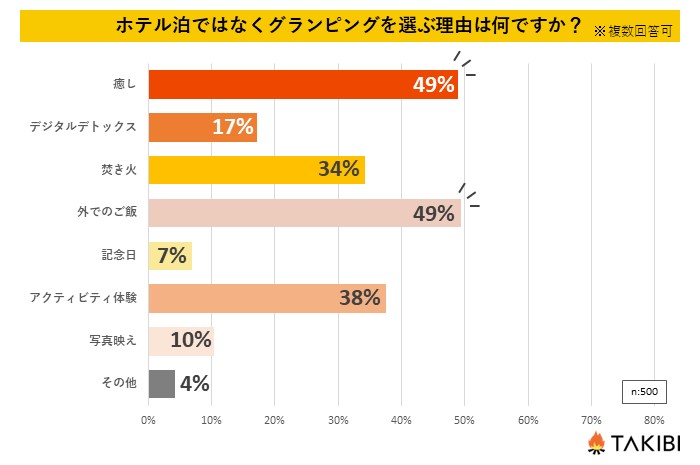 グランピングに行ったことがある・興味がある10代~60代の男女を対象とした「ホテル泊ではなくグランピングを選ぶ理由は何ですか?」というアンケートを行ったところ、1番多かった回答が「癒し」と「外でのご飯」で49%となりました。次いで「アクティビティ体験」が38%、「焚き火」が34%、「デジタルデトックス」が17%という結果になっております。