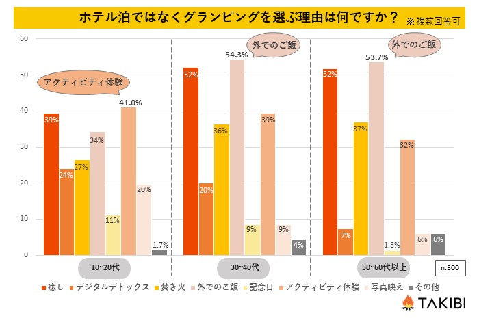 キャンプやグランピングを中心としたアウトドア総合情報サイト「TAKIBI」の運営をおこなう株式会社フォーイット(本社:東京都渋谷区、代表取締役:吉澤竹晴)は、全国の10代~60代までの男女500人を対象にグランピングに関するアンケートを実施し、男女別・年代別等の特徴についてまとめました。