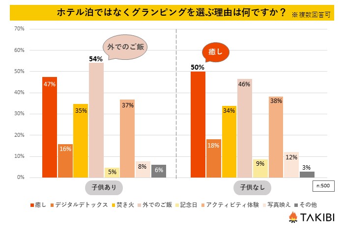 「外でのご飯」「癒し」のどちらにおいても大自然の中で非日常を味わえるという点が、ホテルではなくグランピングを選ぶ大きな要因と言えそうです。