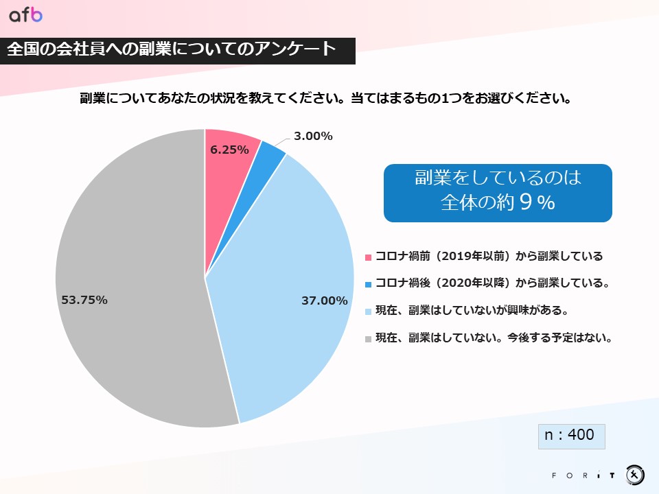 パフォーマンステクノロジーネットワーク「afb(アフィビー)」< https://www.afi-b.com/ >の開発運用をおこなう株式会社フォーイット(本社:東京都渋谷区、代表取締役:吉澤竹晴)は、全国の20歳~60歳までの男女 会社員(正社員)、会社員(契約・派遣社員)400人を対象に副業に関するアンケートを実施し、その特徴についてまとめました。