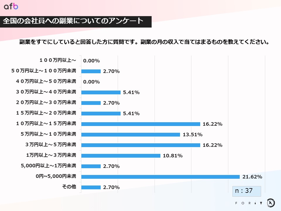 副業で得ている月の報酬についての質問では、「0円~5,000円未満」の回答数が一番多く全体の22%を占めていることがわかりました。