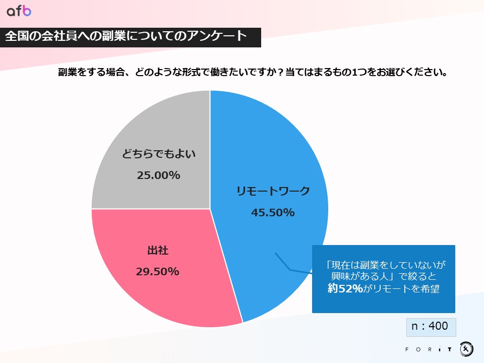 副業は「リモートワーク」と「出社」のどちらがよいかという問いに対しては、リモートワークが約45.5%、出社が約29.5%とリモートワークが上回る結果となりました。
