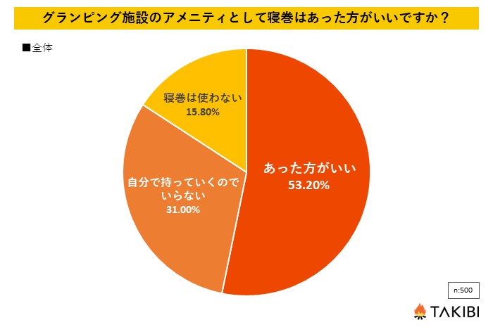 20代~60代の男女を対象とした「グランピング施設のアメニティとして寝巻はあった方がいいですか?」というアンケート調査を行ったところ、「あった方がいい」と回答した方が53.20%、「自分で持っていくのでいらない」が31.0%、また、「寝巻は使わない」という方が15.80%という結果になりました。