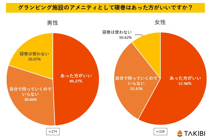男女別で見てみると、「あった方がいい」と回答した方が男性では49.27%、女性では57.96%と、女性の方が多いという結果になり、「自分で持っていくのでいらない」という方は男性では30.66%、女性では31.42%でした。