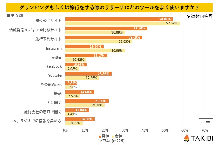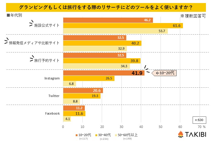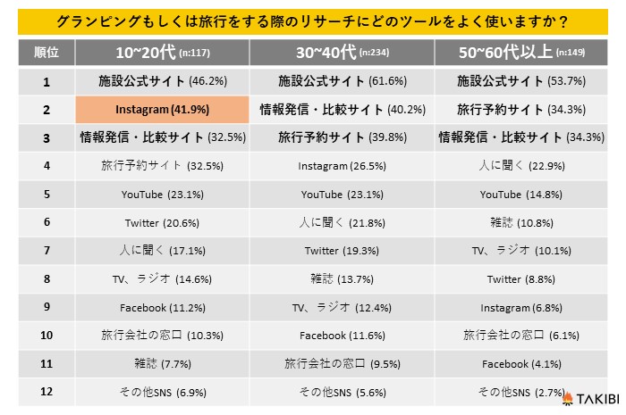 旅行に行く前には実際にその施設に訪れた人の投稿や施設公式アカウントの投稿をチェックして比較ができ、自身が訪れた後にはその思い出を投稿できる、という様に1つのツールでリサーチから共有までを一貫して行える点が使用率が高い理由かもしれません。