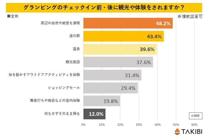 グランピングに行ったことがある・興味がある10代~60代の男女を対象とした「グランピングのチェックイン前・後に観光や体験をされますか?」というアンケートを行ったところ、1番多かった回答が「周辺の自然や絶景を満喫」で48.2%となりました。次いで「道の駅」に行かれる方が43.4%、「温泉」に行かれる方が39.6%という結果になっております。