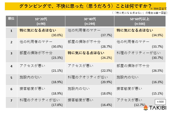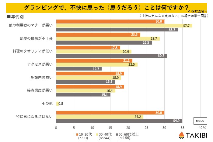 次に、回答が多い順に比較したところ、10~20代、50~60代以上では「特に気になる点はない」の回答が1番多いという結果になりました。「贅沢なキャンプ」というだけあって、施設側のおもてなしが行き届いていたということが推測されます。
