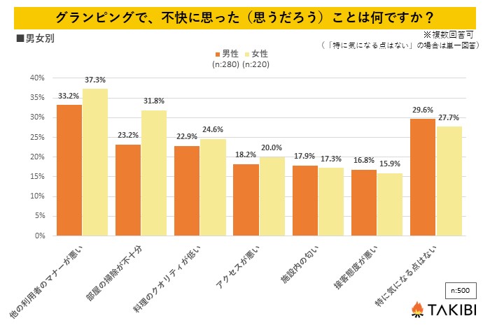 グランピングに行ったことがある・興味がある10代~60代の男女を対象とした「グランピングで不快に思った(思うだろう)ことは何ですか?」というアンケートを行ったところ、約7割が何かしらにおいて「不快」に思っており、1番多かった回答は「他の利用者のマナーが悪い」で35.0%となりました。次いで「部屋の掃除が不十分」が27.0%、「料理のクオリティが低い」が23.6%と続いております。