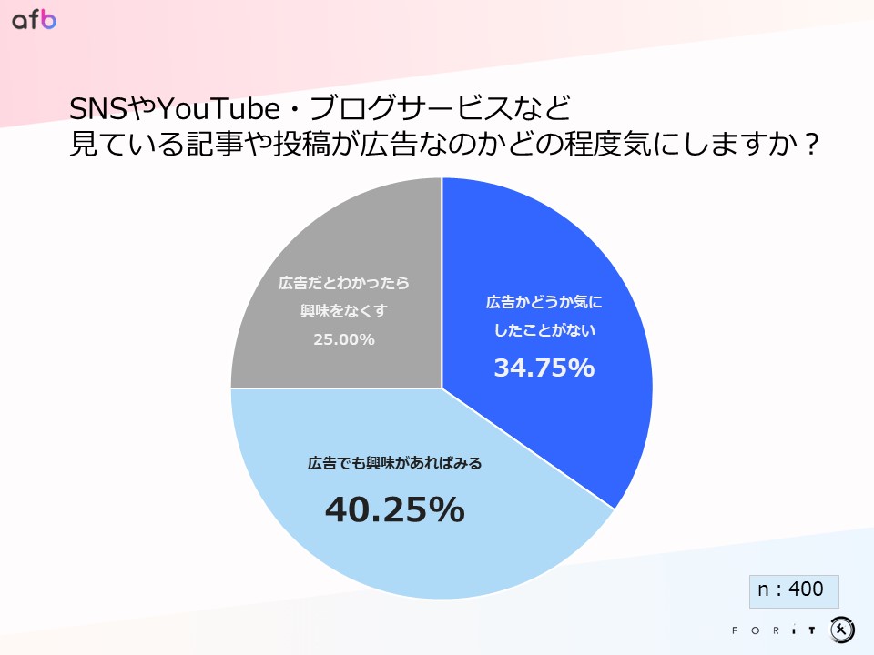 「SNSやYouTube・ブログサービスなど見ている記事や投稿が広告なのか、どの程度気にしますか?」の問いでは、「広告だとわかったら興味をなくす」という層は25%で、「広告でも興味があればみる・広告かどうか気にしたことがない」は75%であることがわかりました。