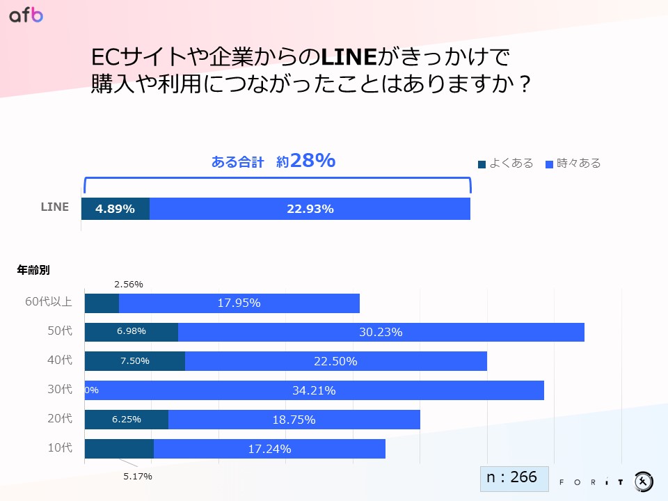 「ECサイトや企業からのLINEがきっかけで購入や利用につながったことはありますか?」の問いでは、「よくある・時々ある」と回答したのは約28%という結果でした。