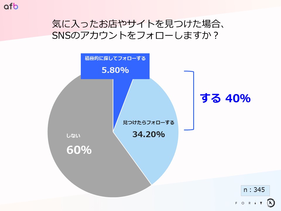 「気に入ったお店やサイトを見つけた場合、SNSのアカウントをフォローしますか?」という問いでは、フォローすると回答した人が40%・しないと回答した人が60%という結果でした。