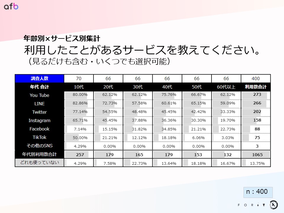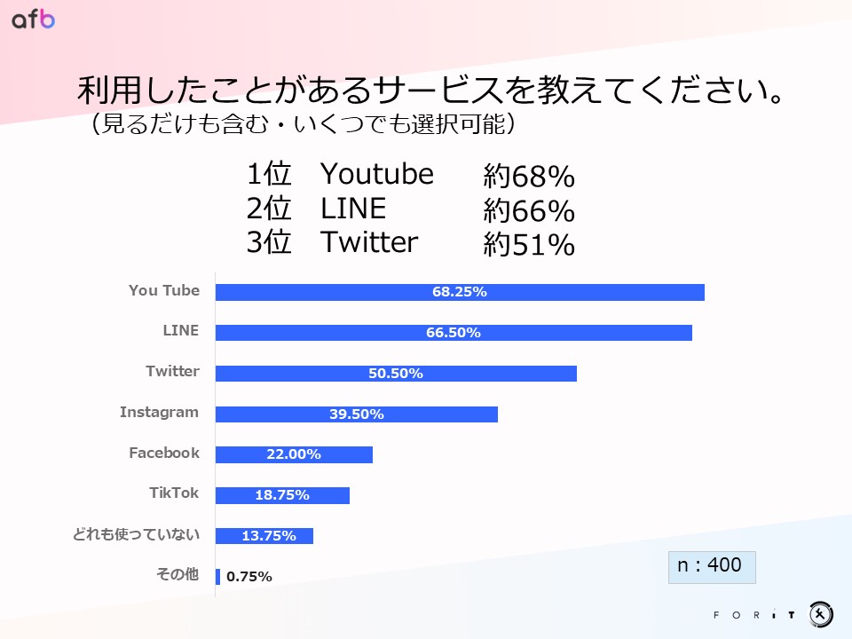 パフォーマンステクノロジーネットワーク「afb(アフィビー)」<https://www.afi-b.com/>の開発運用をおこなう株式会社フォーイットは、全国の18歳~65歳の男女400人を対象に利用したことがあるSNS・サービスに関するアンケートを実施し、その特徴についてまとめました。