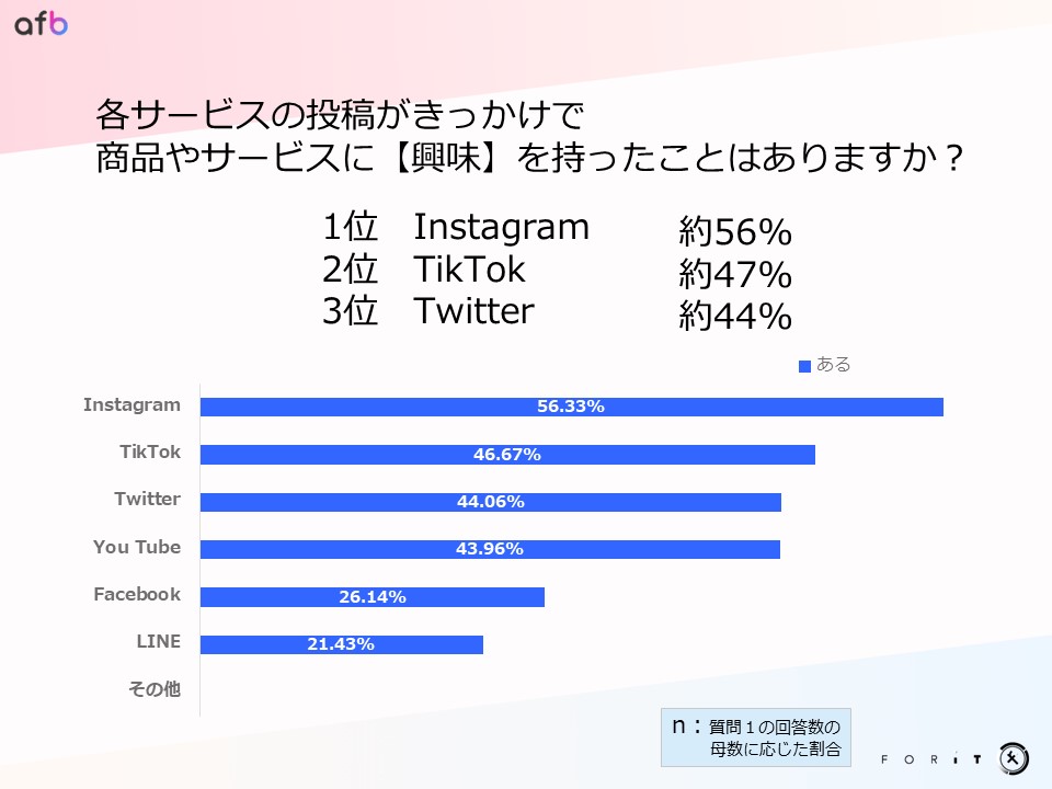 「投稿がきっかけで商品やサービスに【興味】を持った事があるか」の問いでは、