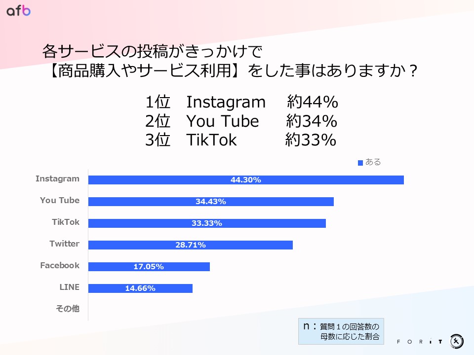 「投稿がきっかけで【商品購入やサービス利用】をした事があるか」の問いでは、