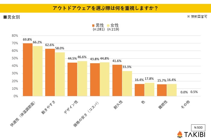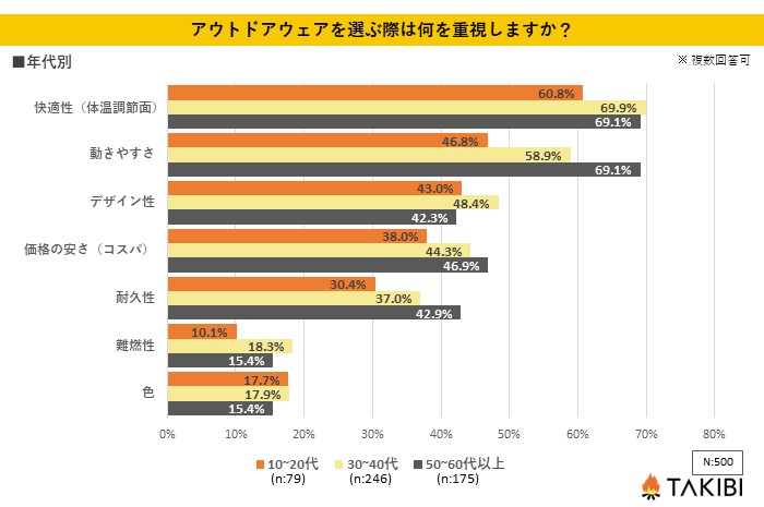 キャンプやグランピングを中心としたアウトドア総合情報サイト「TAKIBI」の運営をおこなう株式会社フォーイットは、全国の10代~60代までの男女500人を対象にアウトドアウェアに関するアンケートを実施し、男女別・年代別等の特徴についてまとめました。