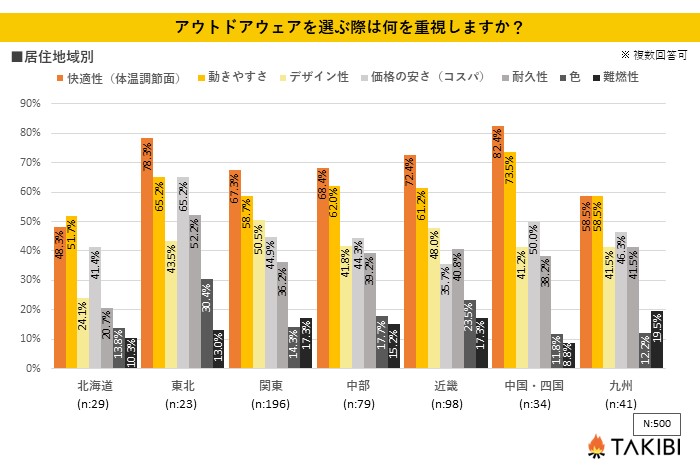 北海道や東北地方など、寒い地域に住んでいる方はデザイン性よりも性能面、コストパフォーマンスの良さを重視していることが見受けられます。特に北海道居住者では、「快適性」よりも「動きやすさ」の回答率が高く、体温調節面で快適であることは大前提として捉えているのかもしれません。